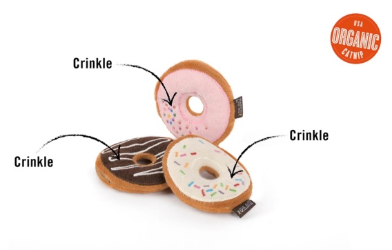 Pluszowa zabawka w kształcie trzech słodkich pączków z kocimiętką w środku. Wszystkie elementy oprócz kocimiętki mają szeleszczące wypełnienie. Kocimiętkę można wyjąć lub wymienić na nową, ponieważ z tyłu jest kieszonka otwierana na rzep.