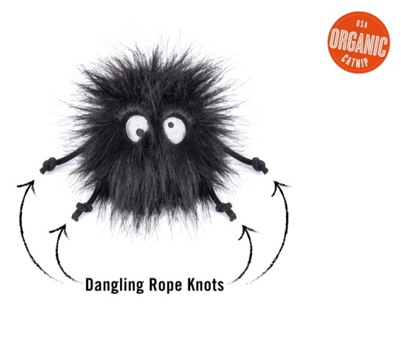 Pluszowa zabawka w kształcie rozbrykanej futrzanej kulki ze sznurkami i kocimiętką. Kocimiętkę można wyjąć lub wymienić na nową, ponieważ z tyłu jest kieszonka otwierana na rzep.