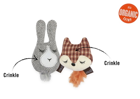 Pluszowa zabawka w kształcie rudego liska i szarego zajączka z ekologiczną kocimiętką.  Obydwie zabawki oprócz kocimiętki mają szeleszczące wypełnienie. Kocimiętkę można wyjąć lub wymienić na nową, ponieważ z tyłu jest kieszonka otwierana na rzep.